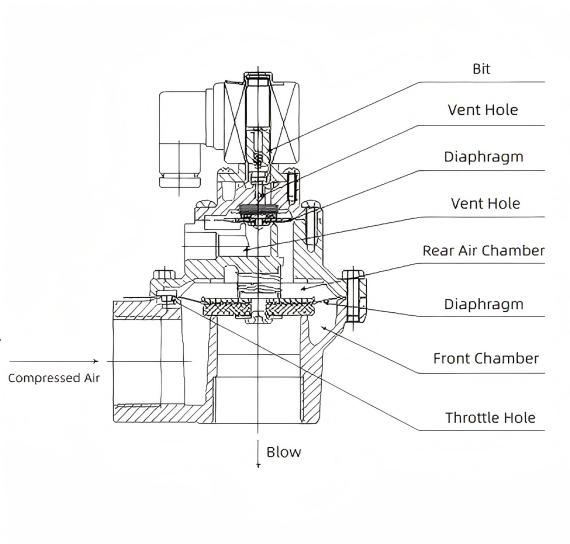 Дијафрагма дели електромагнетни импулсни вентил на предњу и задњу комору. Када се компримовани ваздух доводи кроз отвор за гас у задњу комору, притисак у задњој комори приморава мембрану да затвори излаз вентила, стављајући електромагнетни импулсни вентил у „затворено“ стање. Када електрични сигнал из контролера пулсног млаза престане, арматура соленоидног вентила се ресетује. Отвор задње коморе се затвара, а повећани притисак у задњој комори приморава мембрану да затвори излаз вентила, враћајући соленоидни вентил у „затворено“ стање. Електромагнетни импулсни вентил контролише отварање и затварање отвора за растерећење тела вентила преко електричних сигнала. Током растерећења вентила, гас под притиском у задњој комори се испушта, док се гас под притиском у предњој комори пригушује вакуумским портом мембране, подижући мембрану да би се покренуло пулсно дување. Када тело вентила престане да се празни, гас под притиском брзо пуни задњу комору кроз отвор за пригушивање. Због разлике у областима које носе силу са обе стране мембране у односу на тело вентила, сила гаса у задњој комори постаје доминантна. Ово поуздано затвара мембрану преко отвора за пражњење вентила, заустављајући пражњење пулсног вентила.